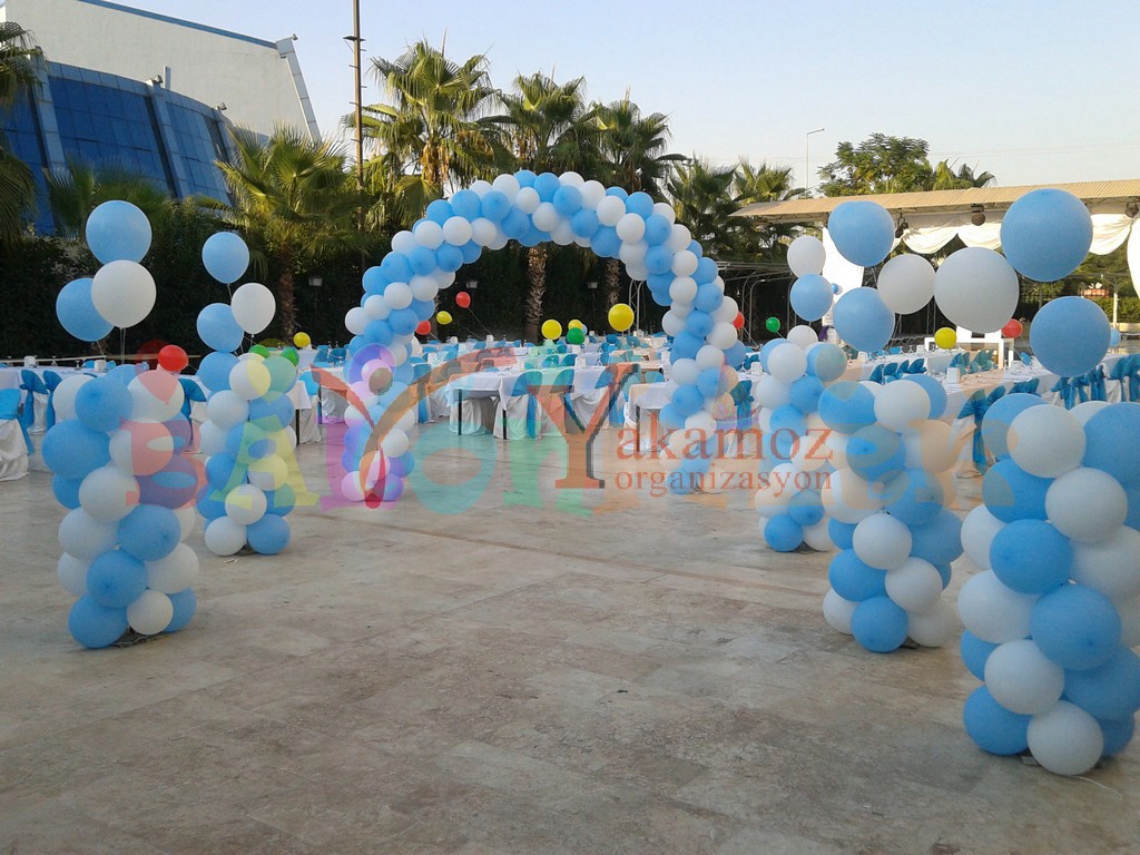 Mekanın giriş bölümüne kapı tak balon ve papatya balonlar. davetli bölümü iç balon dekorasyonu ( paptya balonlar top balonlar ahize balonlar ve sütün balonlarla şık tasarmlar elde edilmekte; davete sünnet havası verilmektedir). Sünnet düğünü konseptine uygun bolanlarla nazar boncuğu yapılmakta.